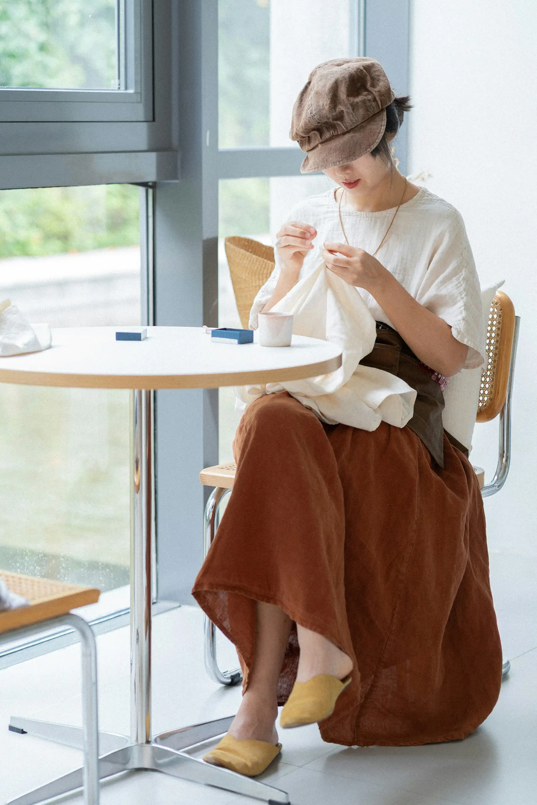 From embroidery to photography, from painting to crochet, we devote an entire afternoon to our favourite hobby, whatever it may be. Accompanied by a cup of tea, a girl in a reddish skirt embroiders a pristine fabric, echoing the elegant lines of the zips by Lanfranchi Lampo Zippers. The silks by Liberty Fabrics are infused with the vibrant shades of a mandala coloured with felt-tip pens, which are then placed back into their case, giving rise to the colourful lines reflected in the ribbons created by Vostex. The linen and cotton by Sictess spread like delicate blue brushstrokes across white ceramics, while a minimalist wire sculpture takes shape, evoking the elegance of Preppy accessories. The cotton canvases by Offline by Eurotessile are transformed into a blue-and-cream graffiti on a wall that will tell a story through colour. On a desk, fresh flowers decorate a scene dominated by watercolours that seem to tint the patterns by Stam Art Group, while the twill and satin by Garage Textile recall a female portrait rendered poetic by softly blended tones. Finally, a girl focuses all her attention on her crochet work, illuminated by the light filtering through the window, as the embroideries by Orsini capture the purity and delicacy of craftsmanship. The sinuous forms by Lenzi Bottoni echo the shades of dusk over a meadow, captured by someone who has spent the afternoon clicking a camera shutter, preserving every detail and every emotion.