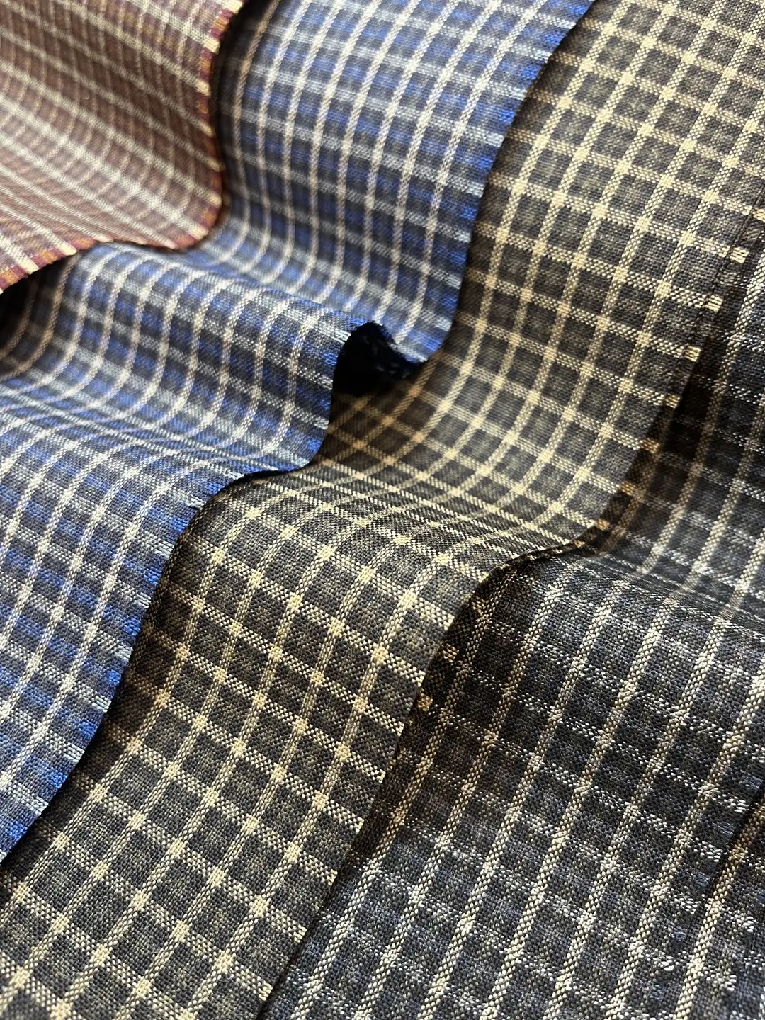 The range expands through wool, silk, and linen blends, explored in playful hues and considered patterns that introduce fresh movement and contrast. Textured cotton, silk, and linen fabrics with a distinctive slub character add further depth, offered in both plains and patterns to enrich the overall story.