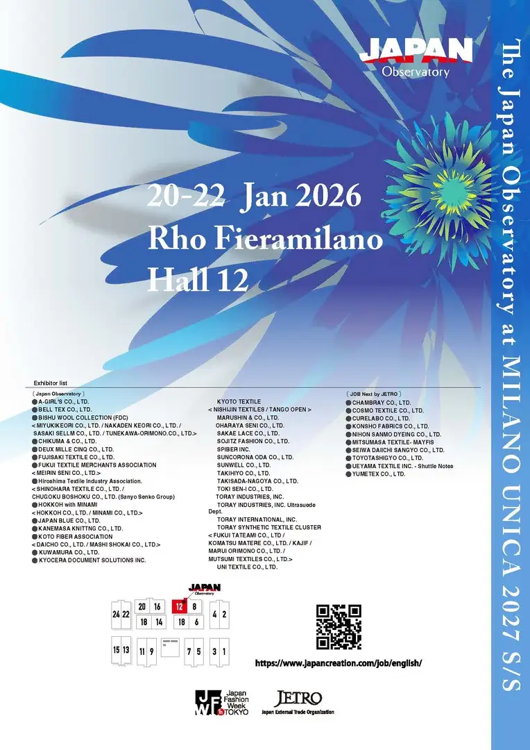 “The Japan Observatory, organized by JFW and JETRO, is a dedicated showcase at the global textile fair Milano Unica — bringing together carefully selected Japanese textile manufacturers and high-quality material producers. It features both business-booth exhibitions and a Trend & Index corner where Japanese craftsmanship, innovation textiles, and sustainable materials are presented to international buyers.”