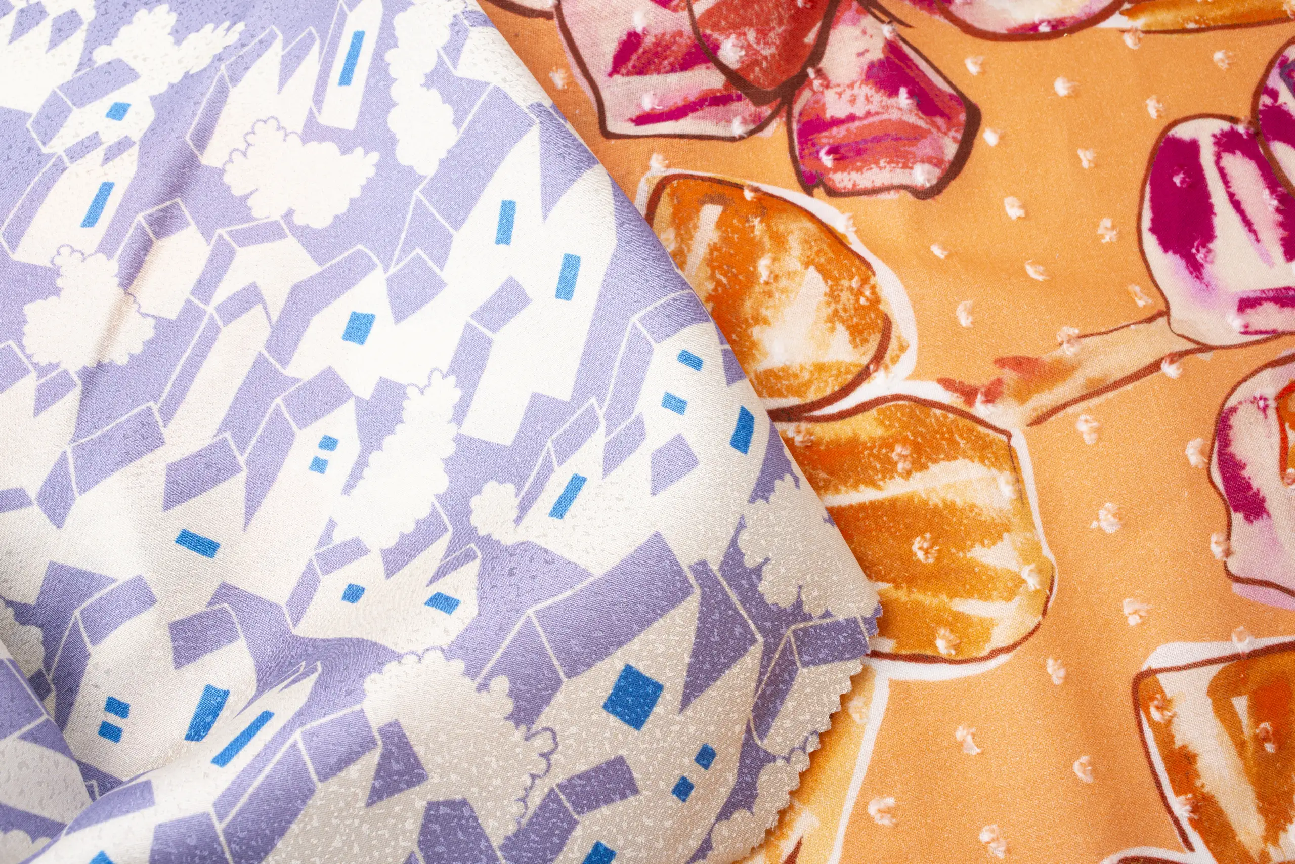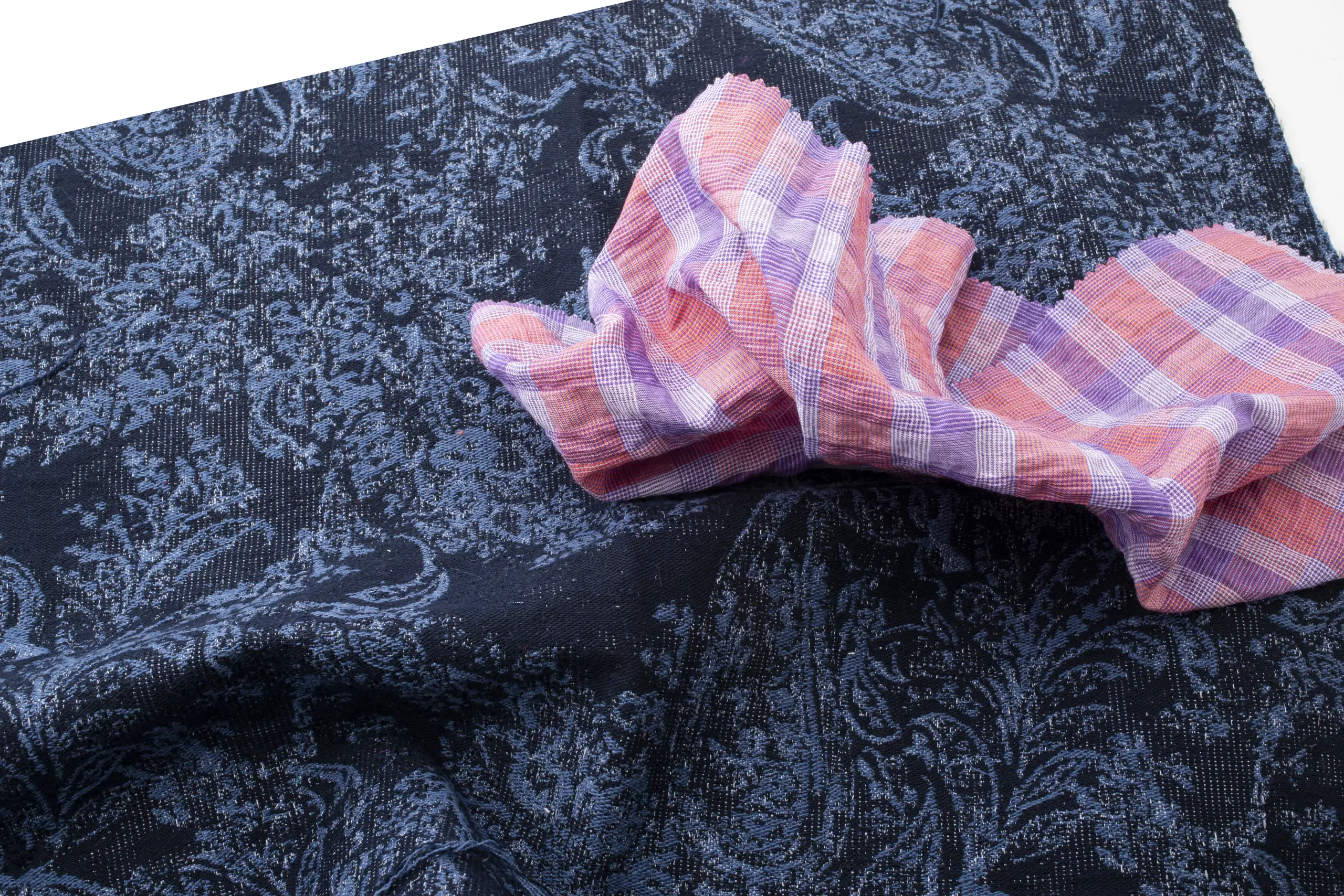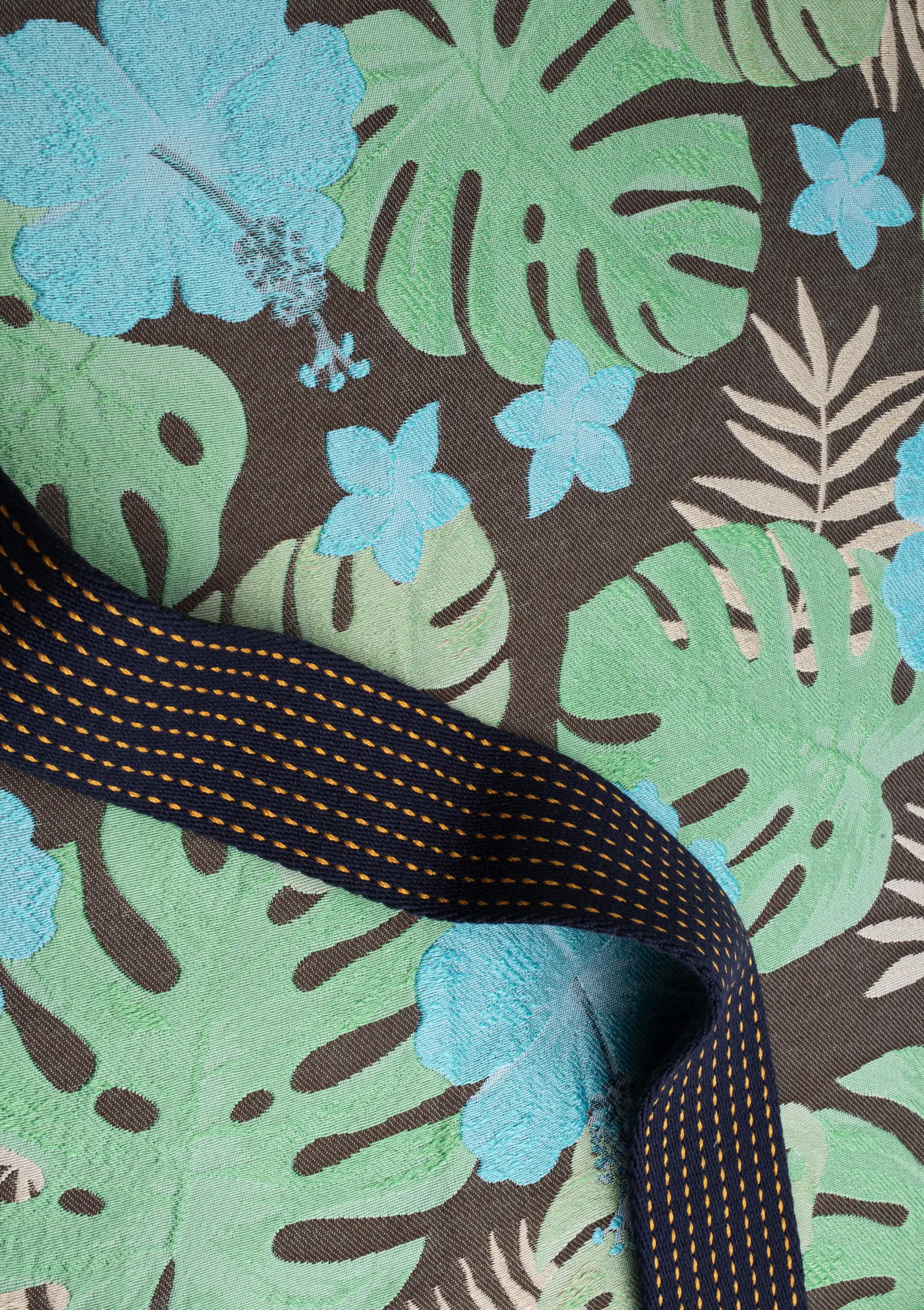 Amid exotic landscapes and overwhelming colour palettes, we fly towards a land suspended on the Equator, inhabited by enchanting nature and astonishing animals: Ecuador. The first stop leads to the Cathedral of the Immaculate Conception in Cuenca, emerging among the branches like an unexpected vision, much like the yellow-ochre canvas by Texmoda that surfaces beside green and beige tweed. Not far away, in Quito’s Parque La Carolina district, the metallic jacquards by Stola align to evoke the shades and slender verticality of the striking Epiq building. High in the Andes, Lake Quilotoa gleams, set within lush vegetation, mirroring the elegant tones and refined patterns by Brunello. Meanwhile, Topp Italia trimmings intertwine like vivid plumage, shaping the intense colours of two magnificent scarlet macaws in their natural habitat. In El Cajas National Park, the path winds through luxuriant greenery, recalling the hues and forms by So.Tex.Co International, while the soft animalier and delicate matelassé by Le Tissu by Domotex convey the calm of a gentle cow grazing peacefully. In Quito, at Plaza del Arte, a vibrant mural engages in dialogue with the geometric and floral prints by Joker’s; a little further on, Mabo buttons reflect the joyful tones of the church of Vilcabamba. As the sun sets, Chimborazo volcano and the Ecuadorian skyline are wrapped in pink-tinged clouds, a soft echo of the splendid tweeds by Jules Tournier. Finally, as darkness begins to fall, Deveaux jacquards and tartans merge, giving shape to the primordial wonder of the land of the Equator, amid intensely coloured skies and flora of sublime beauty.