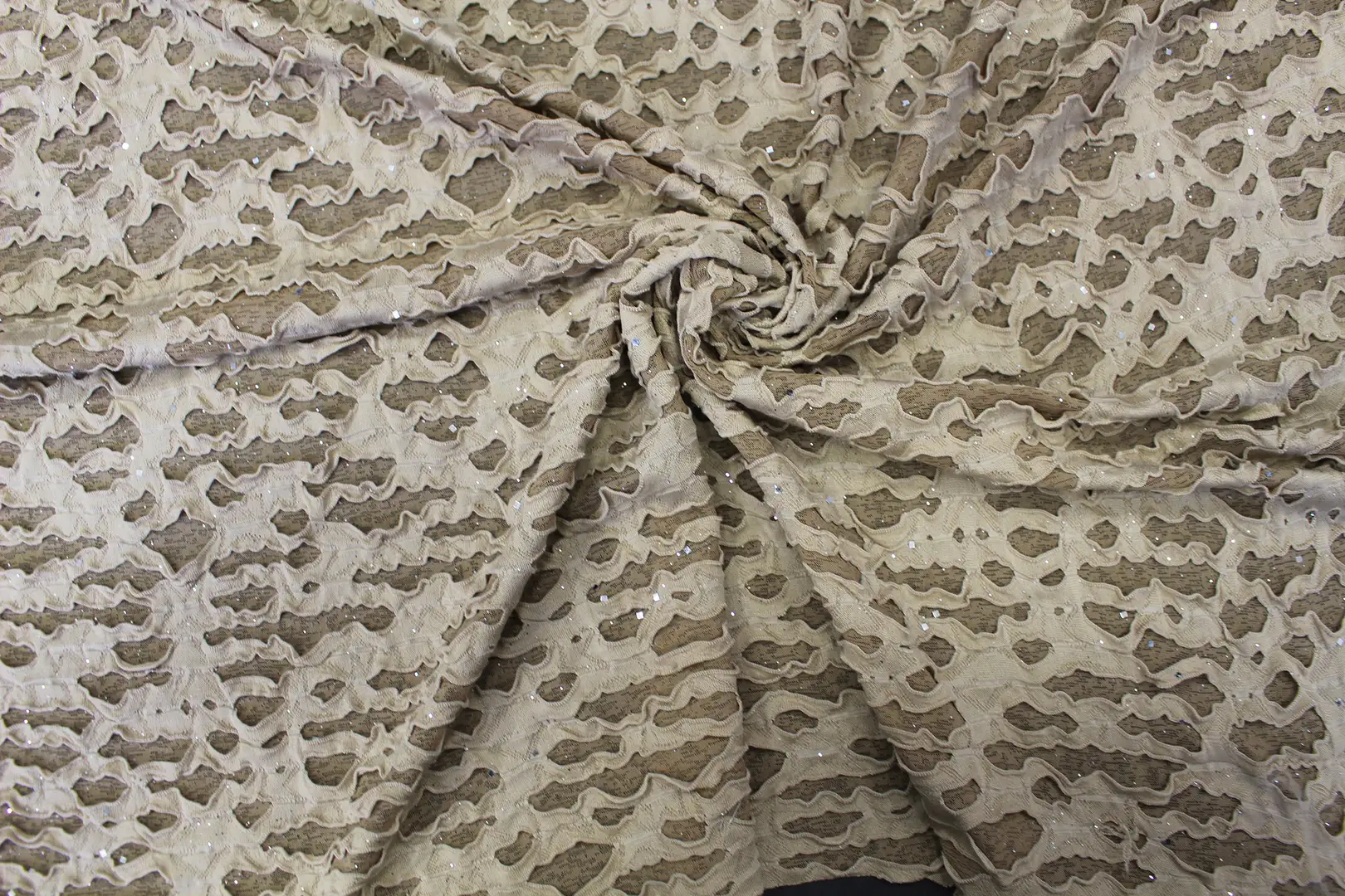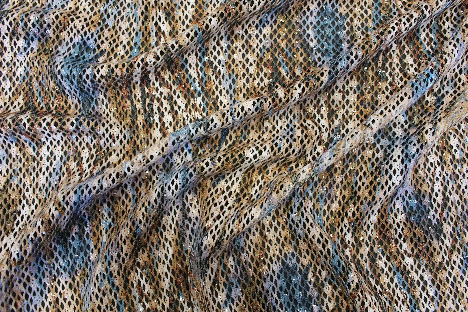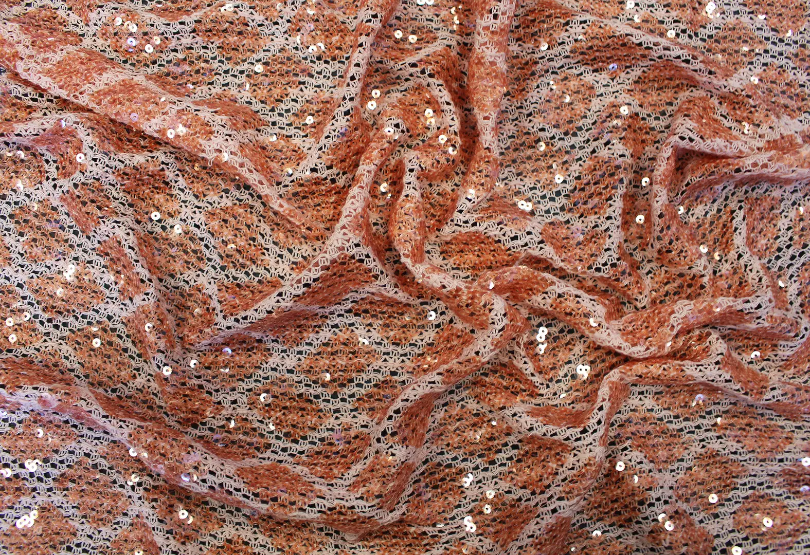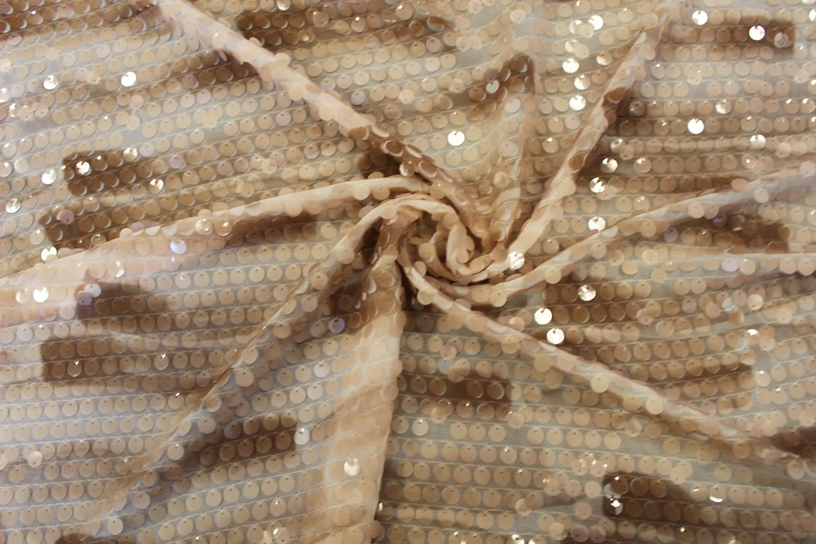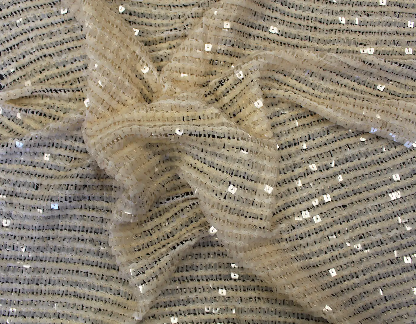 Reti, paillettes e reti con paillettes dialogano tra trasparenze e riflessi luminosi, creando superfici dinamiche e ariose.