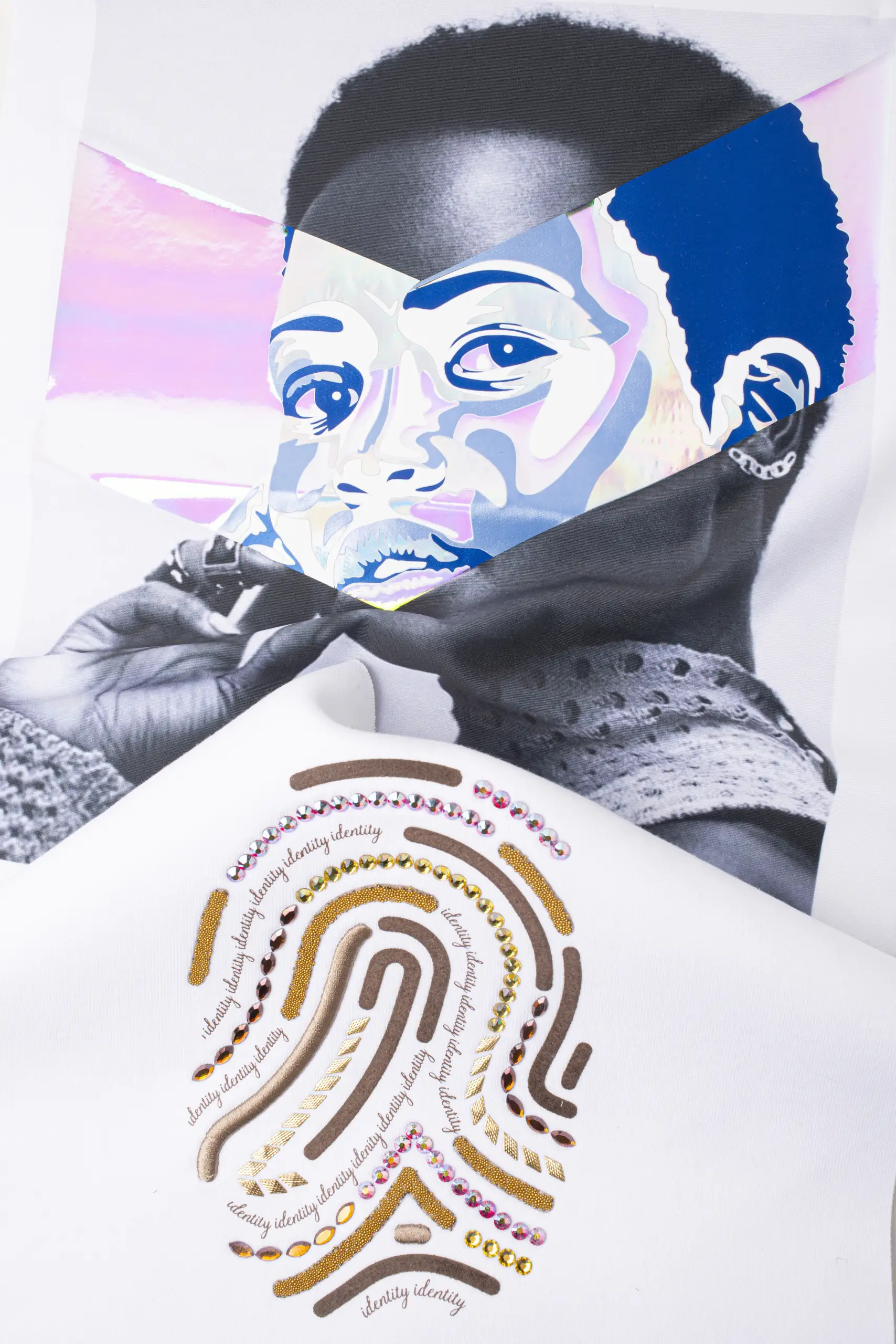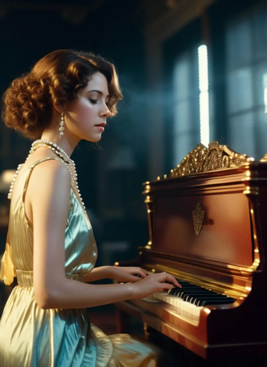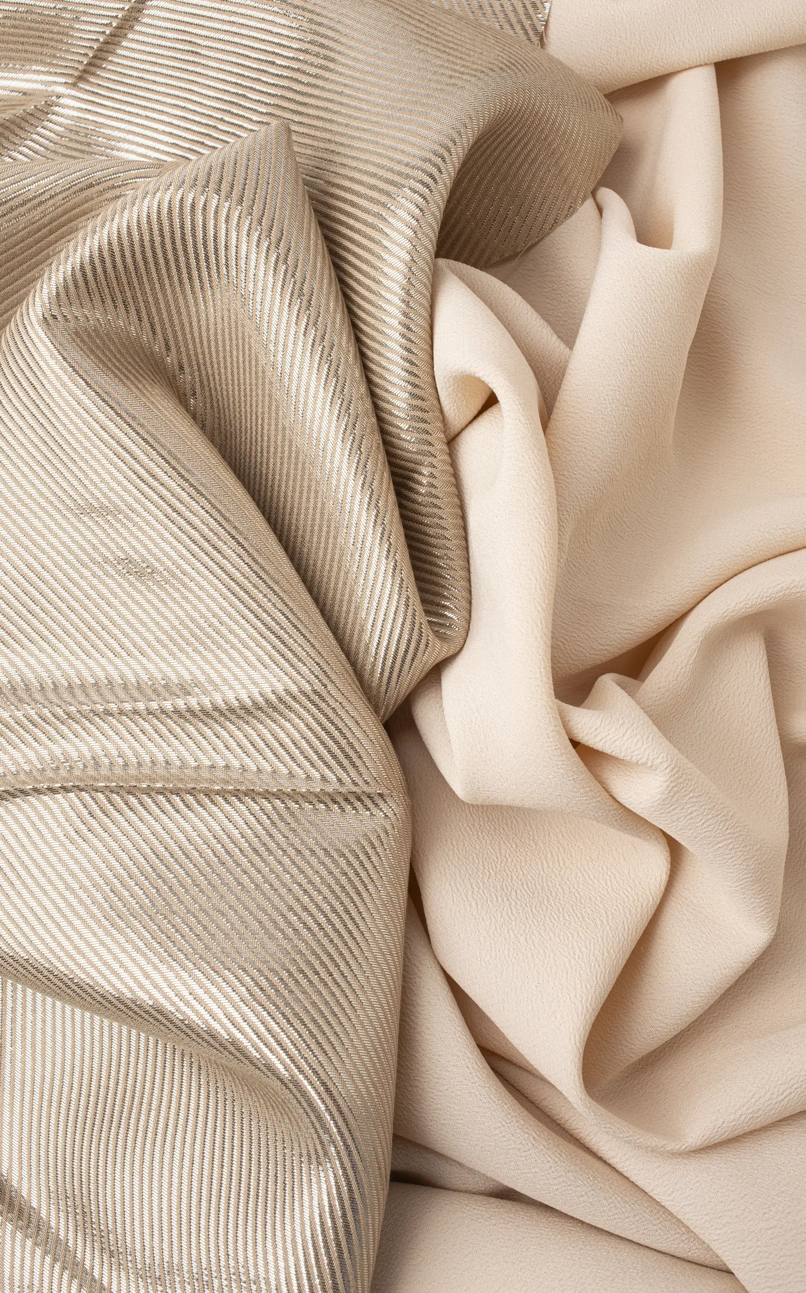 Tra le magie dell’intelligenza artificiale c’è la capacità di dare vita a volti straordinari, figure che fondono la perfezione statuaria con il fascino etereo degli avatar dei videogiochi. Una ragazza, dai lineamenti delicati e luminosi, irradia una luce che si posa sulle tele beige firmate G.D.M. Tessuti, mentre le stampe di Grupo Bordados Oliveira catturano l’essenza di un volto di tre quarti, la cui carnagione sembra splendere di luce propria. Un’altra fanciulla, dall’aspetto tenero e romantico, pare emergere da un sogno, riflessa nelle preziose lavorazioni di Ricamificio Lusi. Le tele di Juan Boluda, invece, si colorano con la grazia di una giovane immaginata davanti a tanti mazzi di fiori rigogliosi. Poi, un ritratto illuminato da riflessi bronzei rivela una bellezza magnetica che vibra sulle eleganti tonalità di Stephen Walters, mentre le passamanerie di Manifattura Modenese richiamano un dolce quadro di una ragazza con il suo cavallo, sospesa tra realtà e immaginazione. Altrove, l’IA evoca un’atmosfera anni ’30: una donna elegante suona il pianoforte, le sue sfumature riflesse nei jersey dorati di Seride, mentre la stampa oro e rosa e il ricamo nero di Airily reinterpretano un’altra bellezza come un ritratto settecentesco sospeso nel tempo. Infine, un volto appare accanto a un prodotto, in un chiaro rimando alle pubblicità di cosmesi: le sete Tiarè catturano la freschezza acqua e sapone della modella, mentre le delicate decorazioni floreali di Eusebio Sanchez suggellano la grazia assoluta di un ritratto scattato in uno splendido giardino botanico immaginario che solo l’intelligenza artificiale può creare.