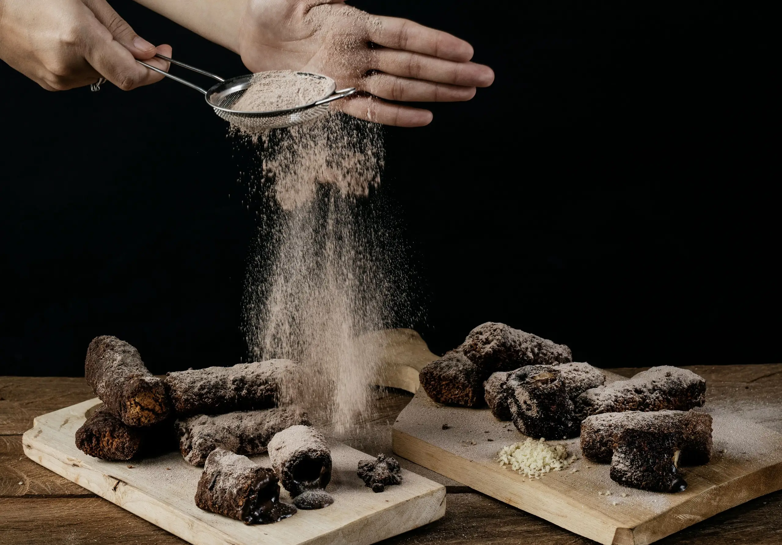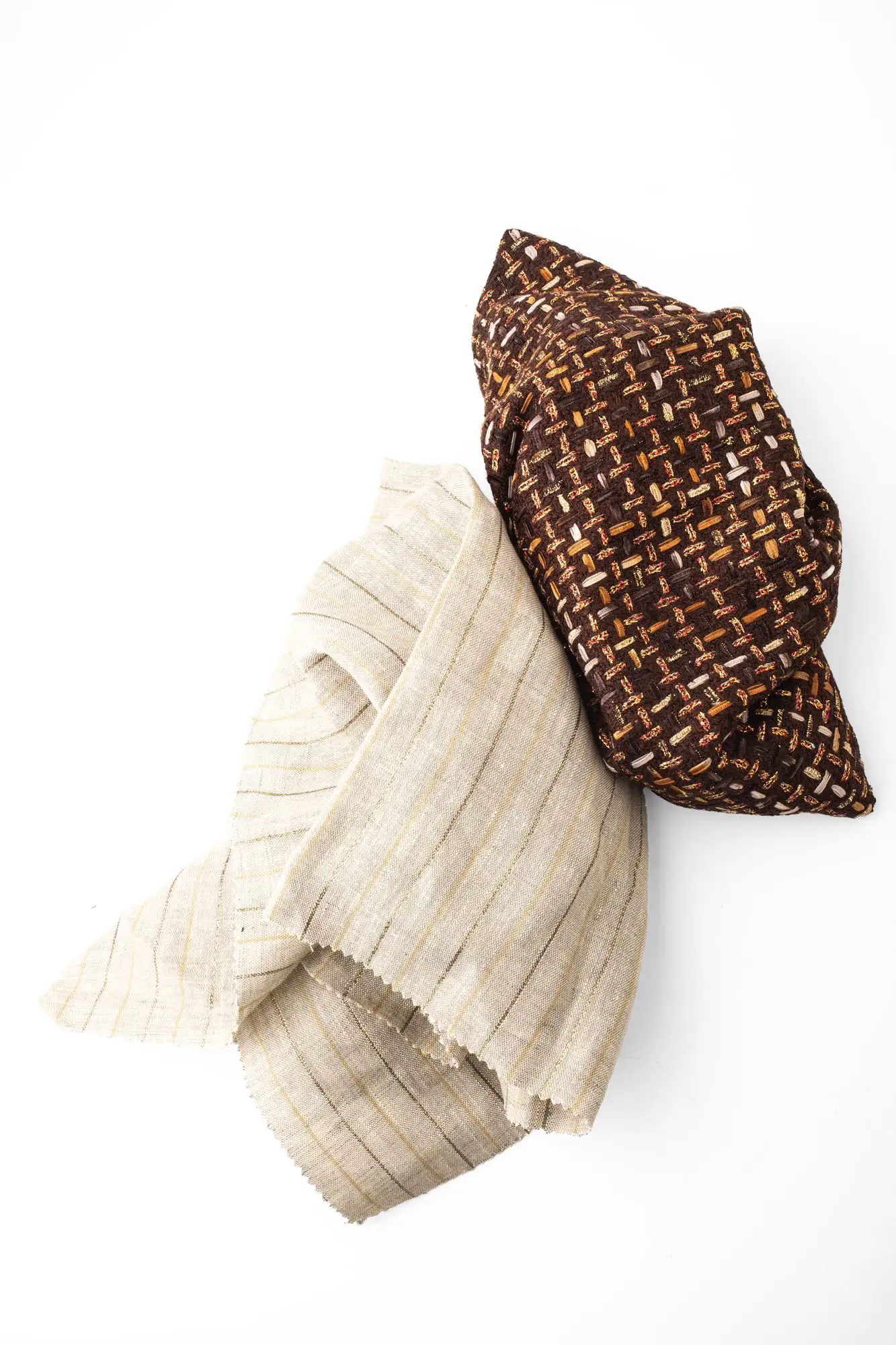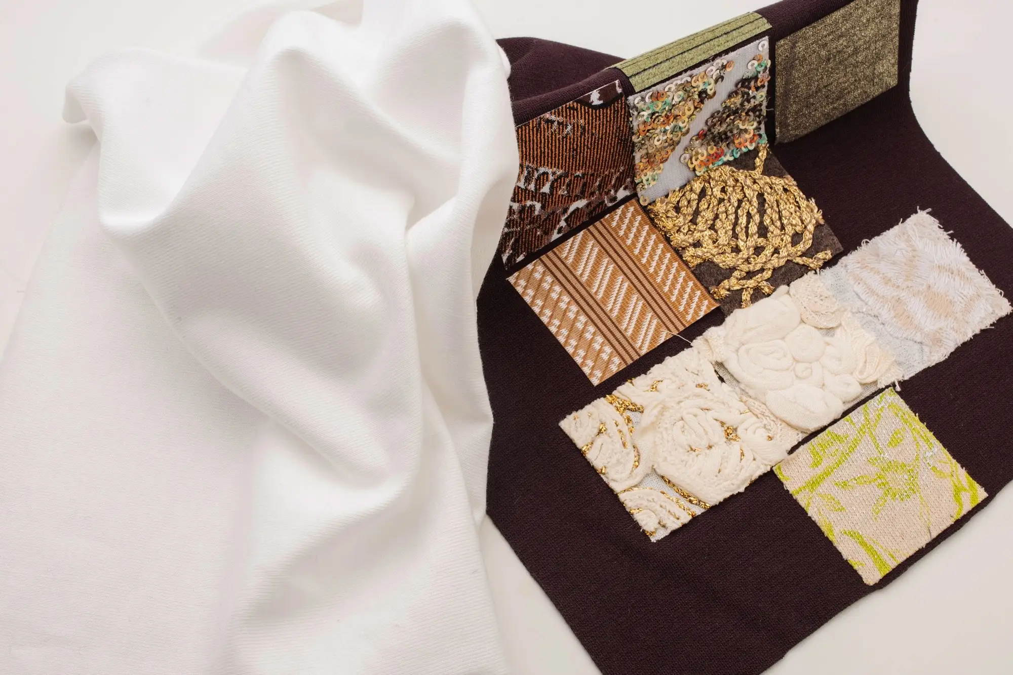 Per nutrire la curiosità e affinare l’arte della cucina, ci lasciamo guidare dalle mani esperte di uno chef stellato in una lezione a noi riservata. Si comincia dagli ingredienti, da quelle verdure adagiate sul tavolo immacolato che creano un gioco di contrasti gioiosi, simile ai vivaci jacquard di Bedini F.lli. Accanto, si posano i bottoni Gritti 1924 come piccole ciotole colme di spezie, ognuna con il proprio profumo e il proprio colore vibrante. Con dei cucchiai misuriamo le quantità necessarie, e le spezie, muovendosi leggere, richiamano le sfumature dei nastri di Nastrificio Angelo Valera. Le tele Nuova Tessilbrenta – Marzotto Group ci accompagnano nella preparazione dell’impasto: il bianco della farina si apre sullo sfondo scuro come una soffice nuvola. Su un piatto già pronto, un taco dal ripieno colorato attende solo l’ultimo tocco, rievocando le tonalità splendenti delle fantasie Eurojersey; mentre i nastri di Manifattura Modenese, disposti con cura, ricreano l’immagine di una bistecca succosa, decorata da piccoli fiori e rametti arancioni. Il lavoro sull’impasto continua, e il tavolo di legno si copre lentamente di farina: così affiorano il tweed bruno e il rigato grigio di Lanificio Campore, come trame nate dal gesto stesso del cucinare. La lana di Botto Giuseppe si tinge di bianco e di rosa, rispecchiando la dolce armonia della farina e delle uova che si uniranno alla nostra ricetta. Arriva il momento dell’impiattamento ma su un tronco d’albero levigato, che richiama le pregiate lavorazioni di Camac Industria Moda, trasformando la presentazione in un piccolo rito. E, infine, il cotone marrone di Telatex si veste di bianco, come i soffici tronchetti di marzapane ricoperti di una sottile neve di zucchero a velo: l’ultimo gesto di dolcezza che conclude questa lezione, in cui la cucina si fa arte e la materia diventa poesia.