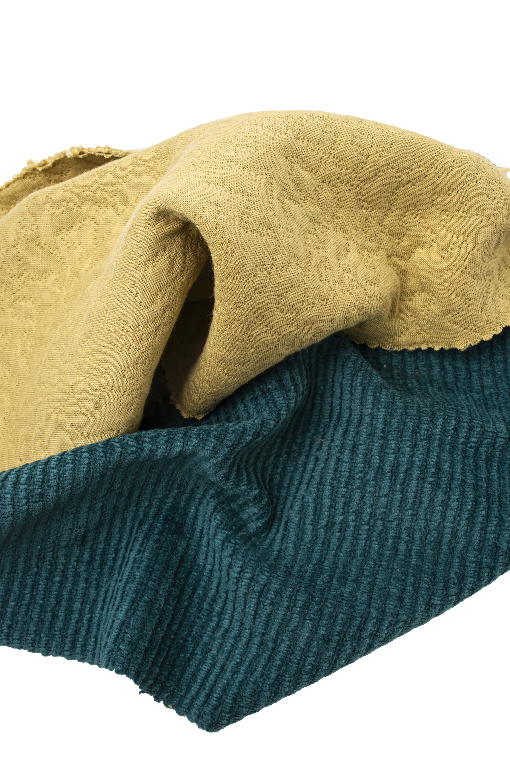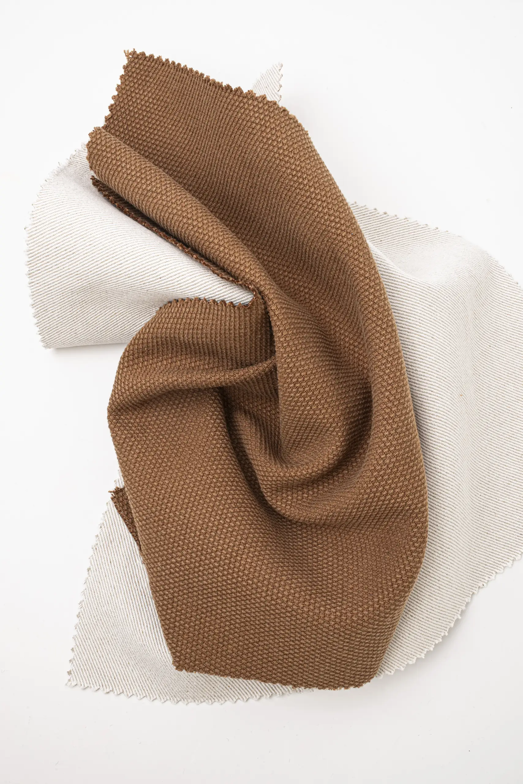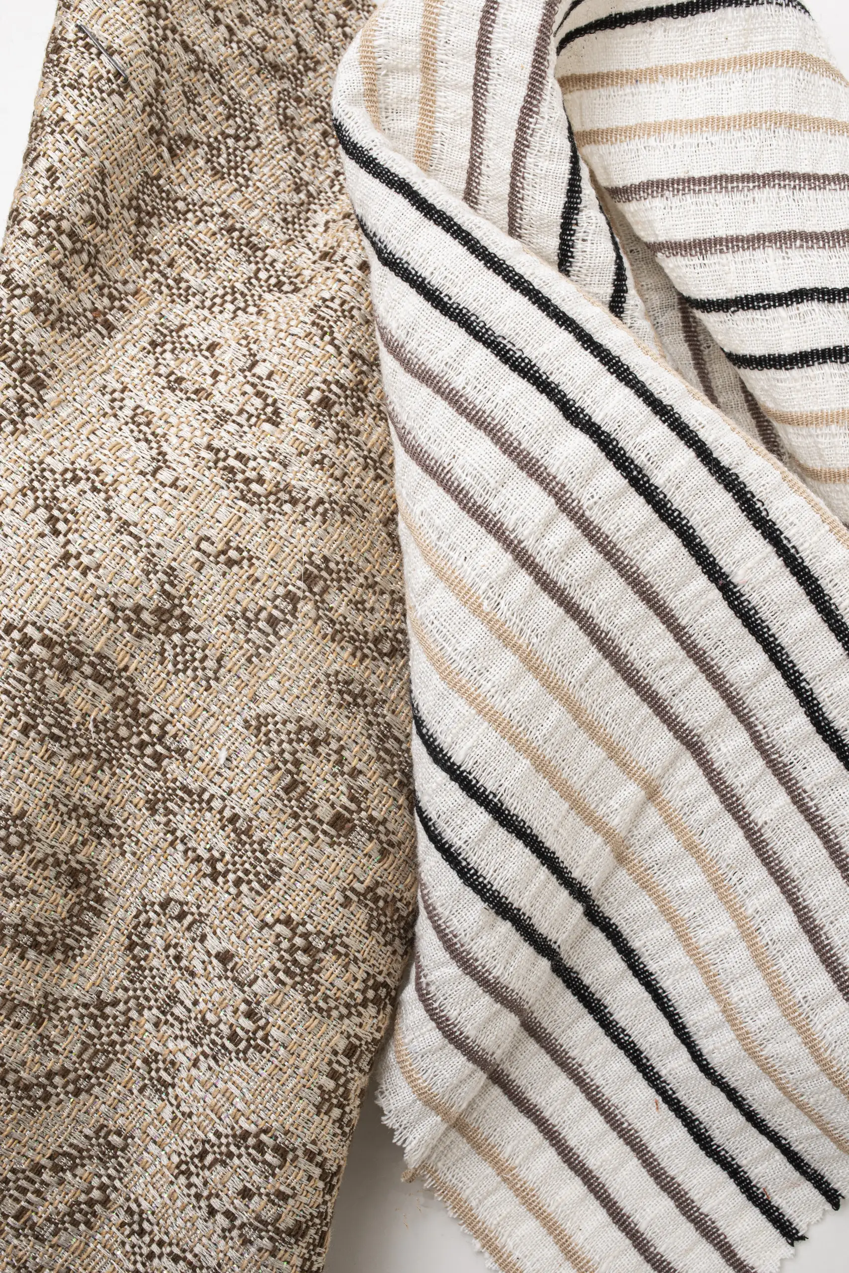 A volte la natura sembra volerci ricordare, con gentile ostinazione, che il pianeta le appartiene: lo fa insinuandosi nelle opere dell’uomo, vestendole di foglie e radici, dando vita a scenari sospesi tra artificio e paesaggio. I rami di un cespuglio si allungano fino ad abbracciare una panchina, avvolgendola in un gesto quasi protettivo che riecheggia le cromie e le trame del cotone organico di Casa da Malha. Poco distante, gli eleganti tessuti di TG di Fabio ricompongono l’immagine evocativa del tempio di Ta Prohm ad Angkor, in Cambogia, dove le radici monumentali degli alberi stringono le antiche strutture in pietra in un dialogo senza tempo. Altrove, la natura sembra farsi spazio all’interno di un’abitazione: sottili rami e foglie attraversano una finestra, richiamando le texture e le sfumature di Manifattura del Prato. Gli accessori biodegradabili firmati Weavabel riflettono, invece, le geometrie irregolari di un lastricato, le cui vie di fuga si tingono di terra ed erba, come se il suolo stesso tornasse a respirare. Intanto, le chiome degli alberi sembrano invadere la carreggiata di una strada costeggiata da campi che riflettono le loro tonalità sul cotone biologico e sulla viscosa di M.T.T. Manifattura Tessile Toscana. Il grigio e il greige di Tescalane si incontrano in un delicato gioco tono su tono, evocando le tonalità di un albero che affonda le proprie radici in un muro di pietra. Dove la natura prende il sopravvento, il cemento si incrina e lascia intravedere il terriccio sottostante, trasferendo la sua forza alle fibre naturali di Telatex, intrise di sfumature autentiche. I jersey ecologici di LMA si dispongono poi come lastre di vetro, tra le quali sembrano essere nate, inaspettatamente, piccole piantine dal verde intenso. In un terreno che si apre in zolle irregolari, alcune foglie emergono con delicatezza, riflettendo le nuance di beige e verde sulle lane vergini di Botto Giuseppe. Infine, le impunture di Trapuntatura Bel Punto – MinervaHub disegnano motivi ritmici che ricordano il potere sorprendente della natura: quello di conquistare e trasformare anche un semplice muro di mattoni rosati, ricoprendolo di una folta edera viva.