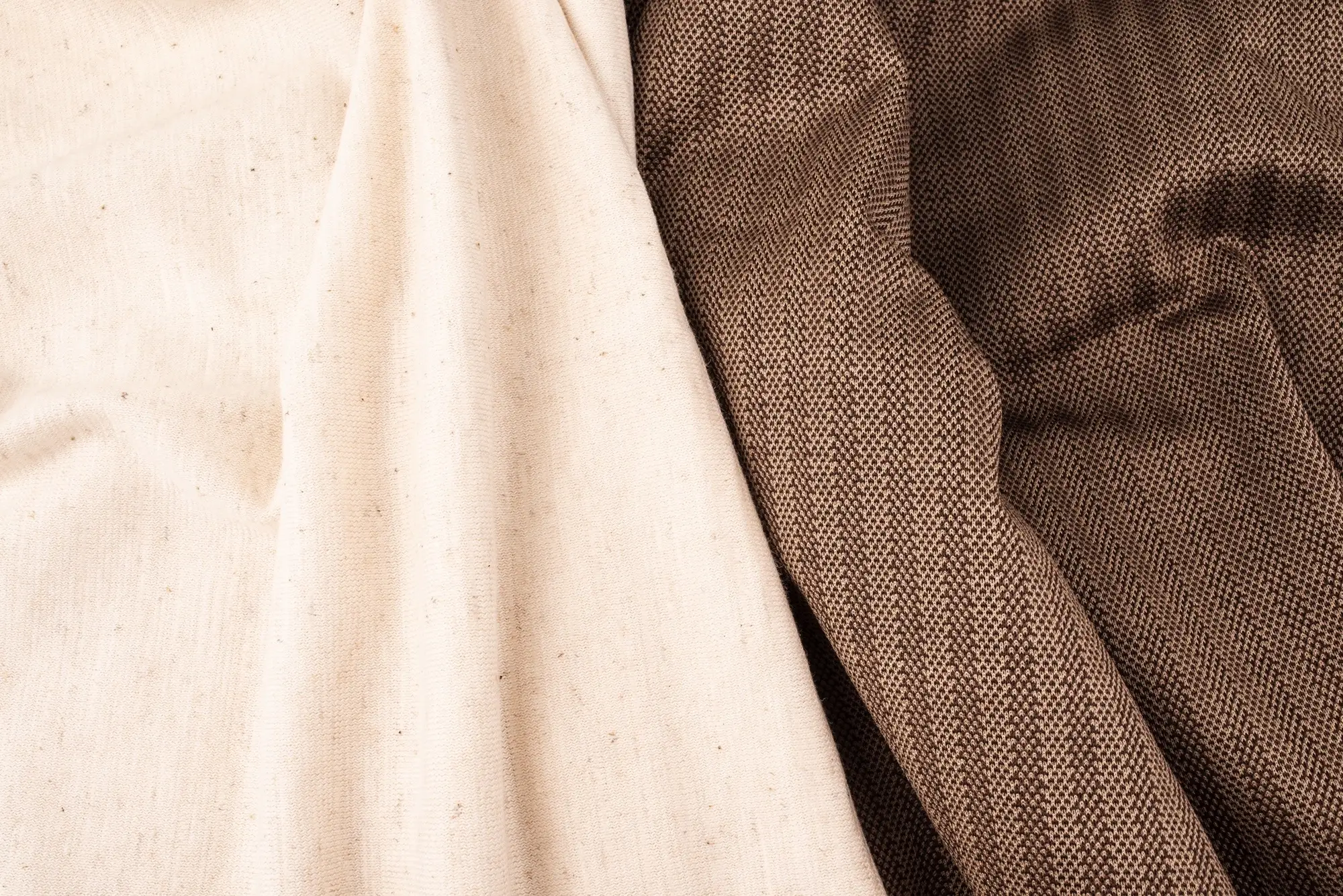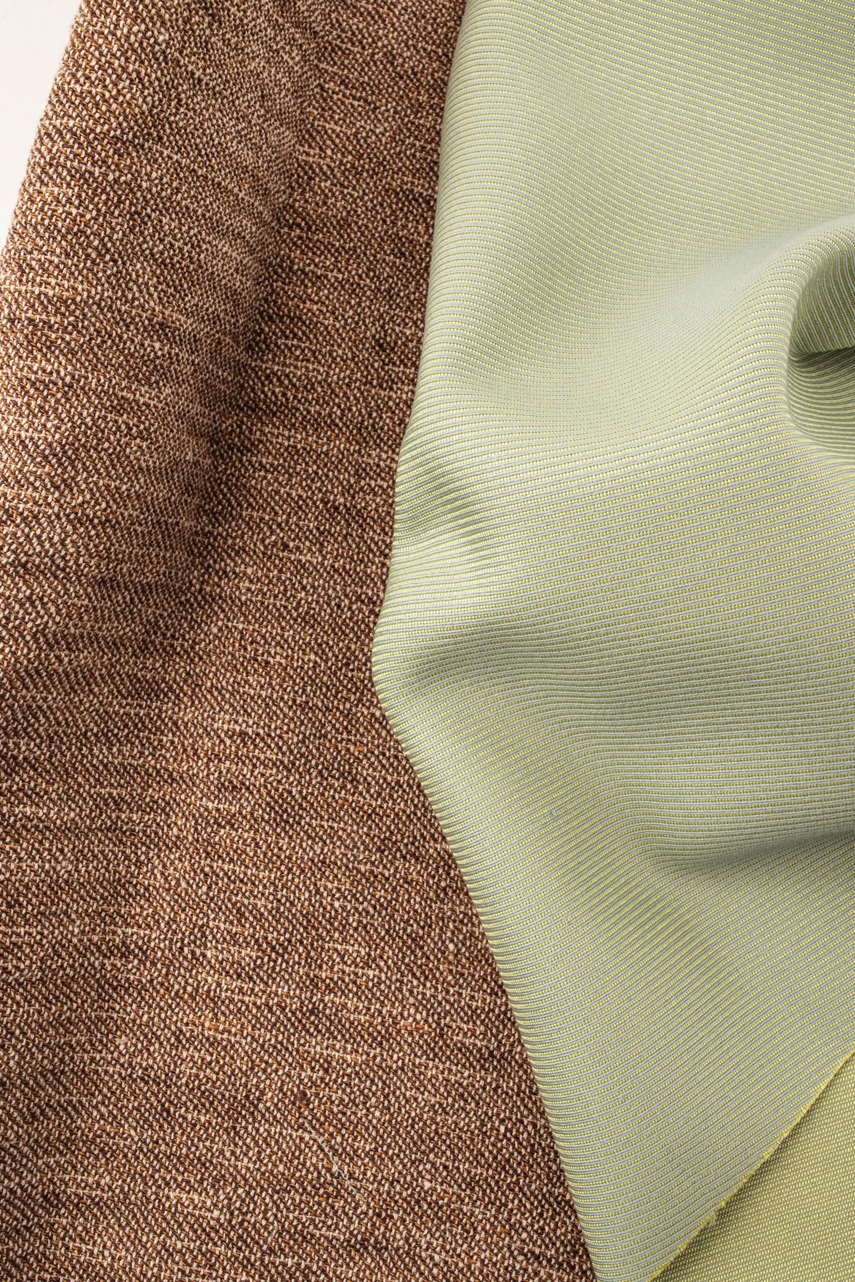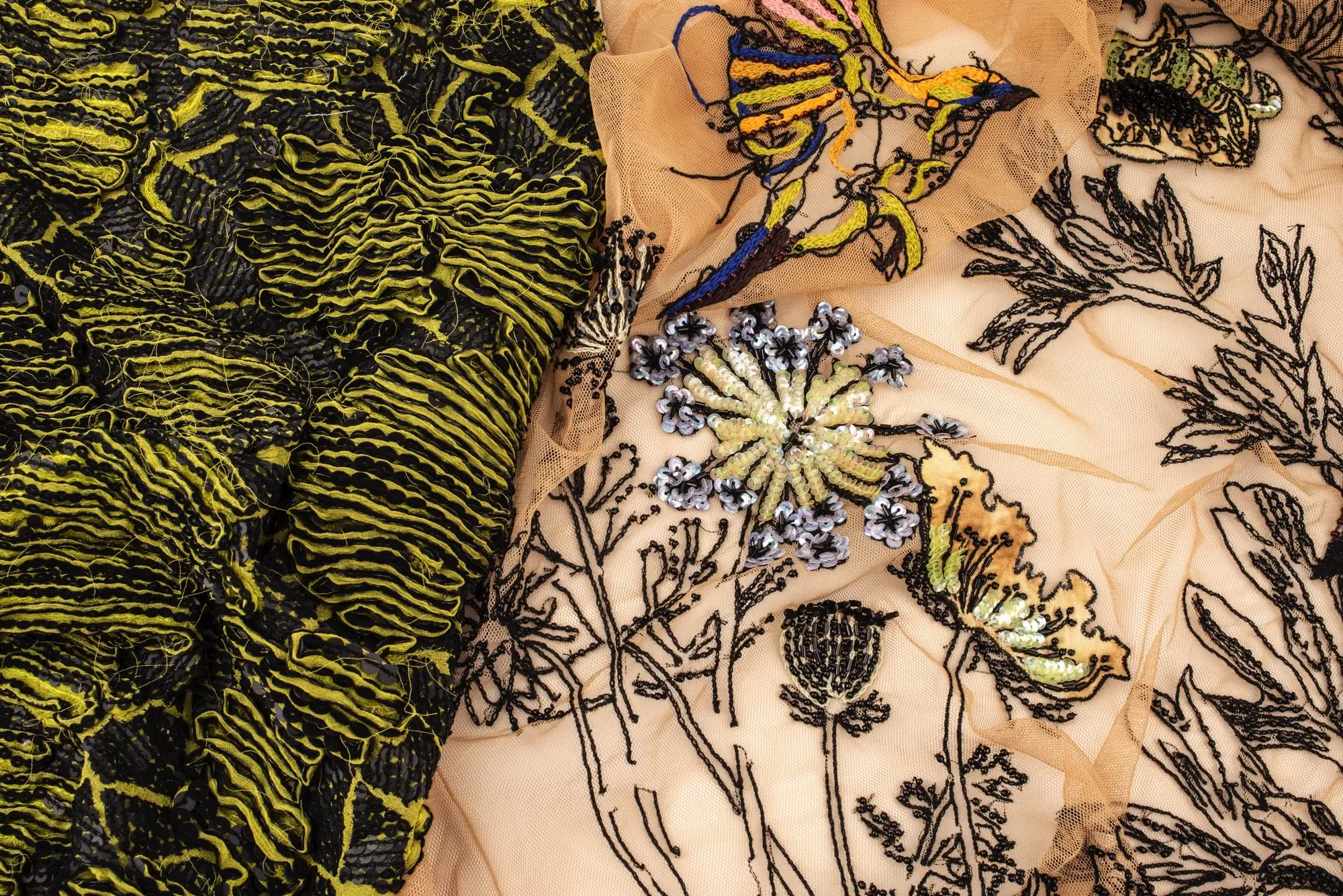 Dai raggi solari nasce un bagliore caldo e diffuso, una luce sospesa che si adagia sulle superfici come un velo impercettibile. Le trasparenze rosate del tulle e quelle verdi dello chiffon di Jato 1991 – MinervaHub si ispirano a quella morbida luminosità che filtra tra i rami al crepuscolo. Le linee sottili e leggere dei nastri di Mokuba by Ribbon Line ricordano i riflessi che si intrecciano con le tende veneziane socchiuse, tracciando percorsi di luce silenziosa. I soffici tessuti di 3C Company evocano la calma casalinga che viene separata dai riflessi esterni grazie ad un velo coprente. NRGY – Staff Ricami – Manifattura Carpigiana propone una passamaneria ricamata e una nappina, le quali, insieme, richiamano la scintillante luce solare che filtra attraverso un cielo nuvoloso. Gli elastici di Fashion Tex replicano la quiete del mattino, quando il sole attraversa timido le tende, disegnando geometrie effimere sulle pareti. Le onde arricciate e sinuose dei nastri di Topp Italia richiamano il luccichio dell’acqua notturna, dove ombra e chiarore si rincorrono come sul fondale di una piscina. Le righe dei popeline di Lanificio Luigi Zanieri, ora ravvicinate ora distanziate, sembrano tradurre il passaggio dei raggi che attraversano il muro bianco fino a sfiorare l’infinito. Gli accessori scintillanti e blu notte di PB Accessories assomigliano alle bollicine che si accendono sotto l’acqua dopo un tuffo, sospese tra luce e buio. Nei tessuti jacquard e tricotina di Beste la luminosità si fa più terrosa, evocando i primi raggi dell’alba mescolati al calore delle foglie all’interno di una foresta autunnale. Infine, le texture di Fiveol Textil traducono l’incontro tra ombra e chiarore: la viscosa nera trattiene la luce, mentre il tessuto retato bianco la lascia filtrare, creando un contrasto vibrante.