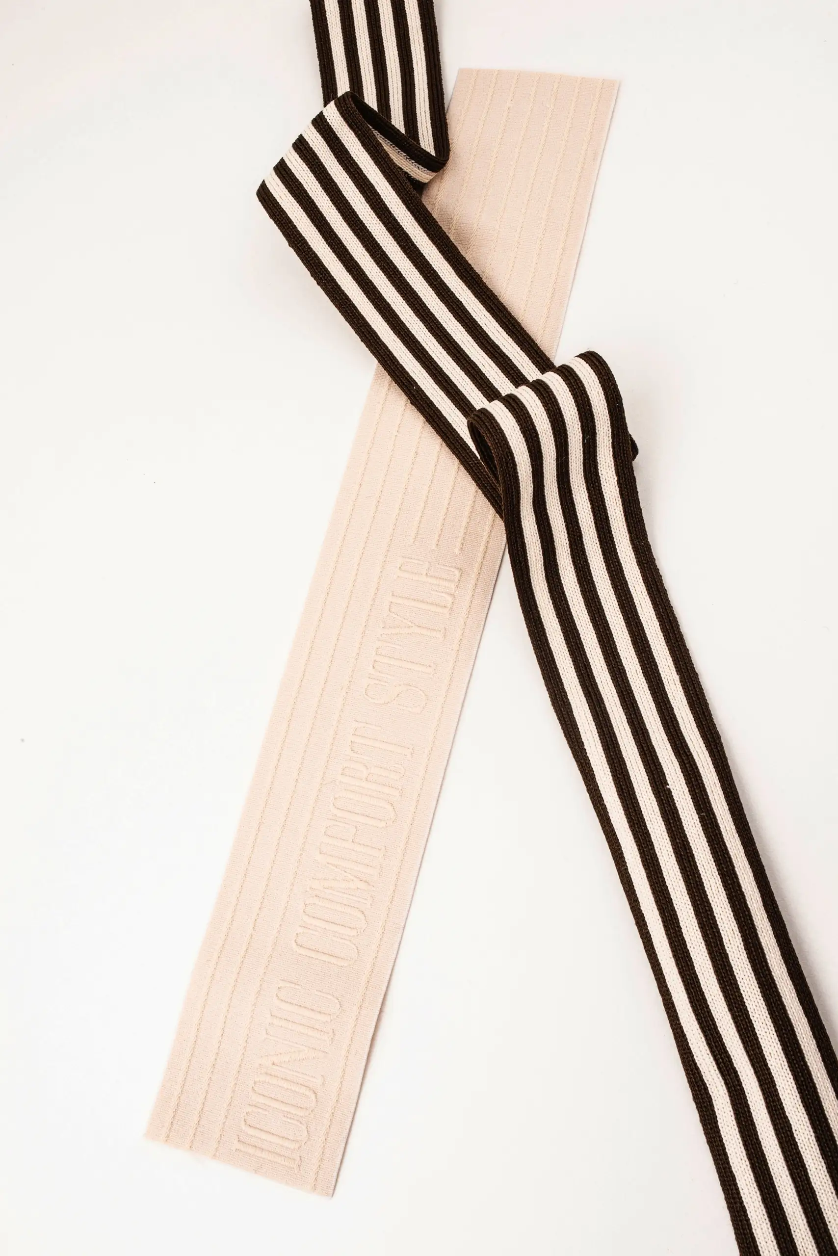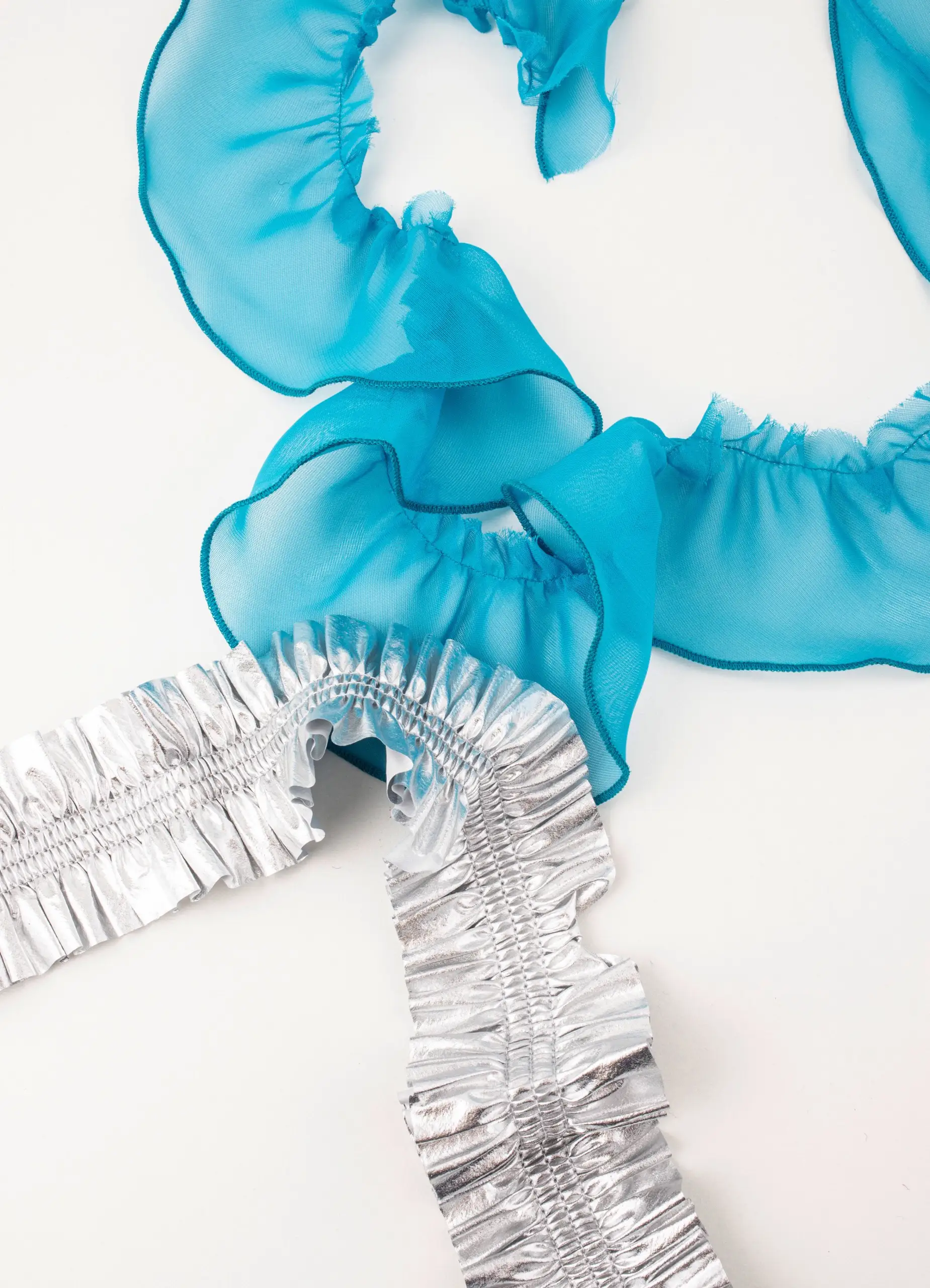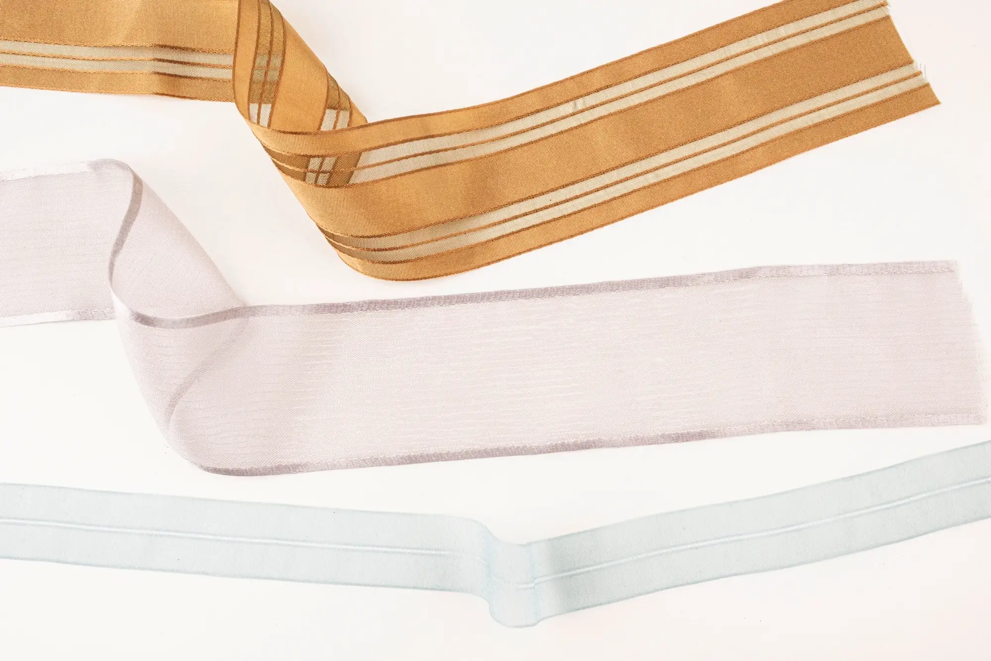 Dai raggi solari nasce un bagliore caldo e diffuso, una luce sospesa che si adagia sulle superfici come un velo impercettibile. Le trasparenze rosate del tulle e quelle verdi dello chiffon di Jato 1991 – MinervaHub si ispirano a quella morbida luminosità che filtra tra i rami al crepuscolo. Le linee sottili e leggere dei nastri di Mokuba by Ribbon Line ricordano i riflessi che si intrecciano con le tende veneziane socchiuse, tracciando percorsi di luce silenziosa. I soffici tessuti di 3C Company evocano la calma casalinga che viene separata dai riflessi esterni grazie ad un velo coprente. NRGY – Staff Ricami – Manifattura Carpigiana propone una passamaneria ricamata e una nappina, le quali, insieme, richiamano la scintillante luce solare che filtra attraverso un cielo nuvoloso. Gli elastici di Fashion Tex replicano la quiete del mattino, quando il sole attraversa timido le tende, disegnando geometrie effimere sulle pareti. Le onde arricciate e sinuose dei nastri di Topp Italia richiamano il luccichio dell’acqua notturna, dove ombra e chiarore si rincorrono come sul fondale di una piscina. Le righe dei popeline di Lanificio Luigi Zanieri, ora ravvicinate ora distanziate, sembrano tradurre il passaggio dei raggi che attraversano il muro bianco fino a sfiorare l’infinito. Gli accessori scintillanti e blu notte di PB Accessories assomigliano alle bollicine che si accendono sotto l’acqua dopo un tuffo, sospese tra luce e buio. Nei tessuti jacquard e tricotina di Beste la luminosità si fa più terrosa, evocando i primi raggi dell’alba mescolati al calore delle foglie all’interno di una foresta autunnale. Infine, le texture di Fiveol Textil traducono l’incontro tra ombra e chiarore: la viscosa nera trattiene la luce, mentre il tessuto retato bianco la lascia filtrare, creando un contrasto vibrante.