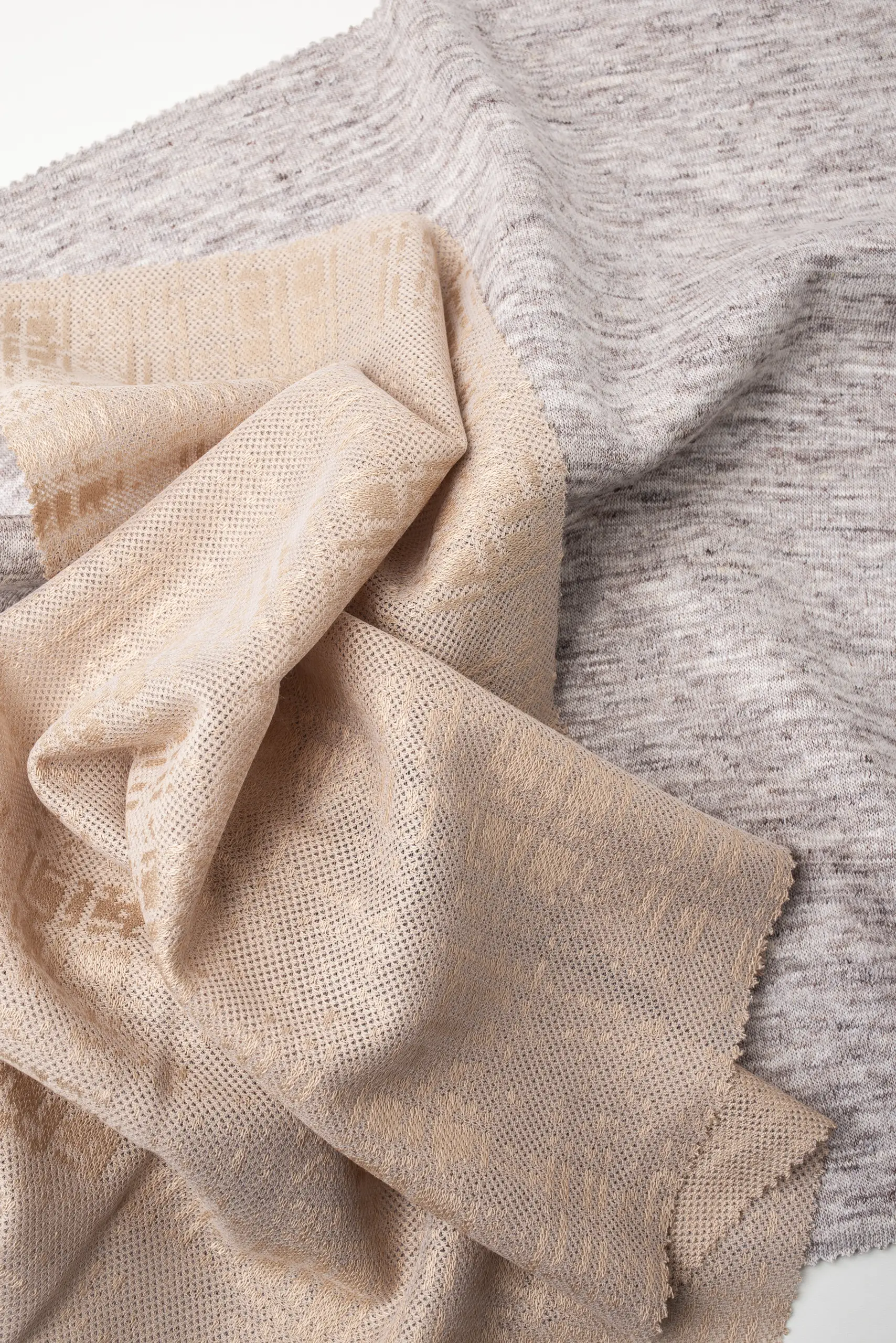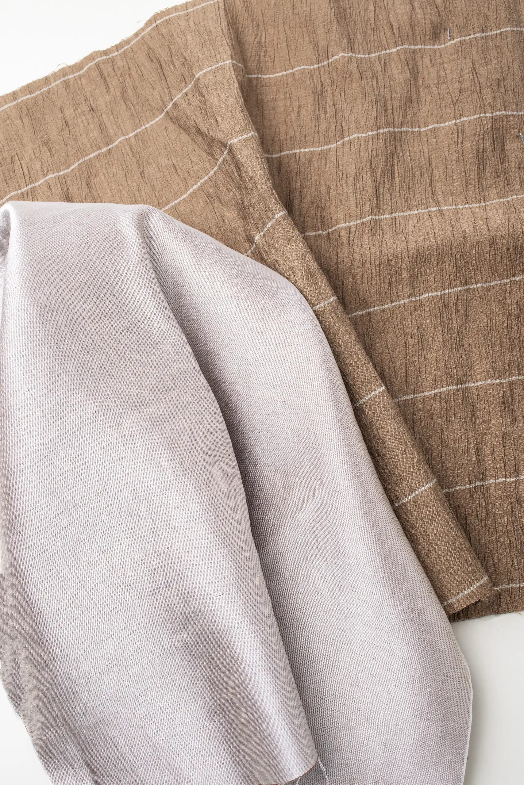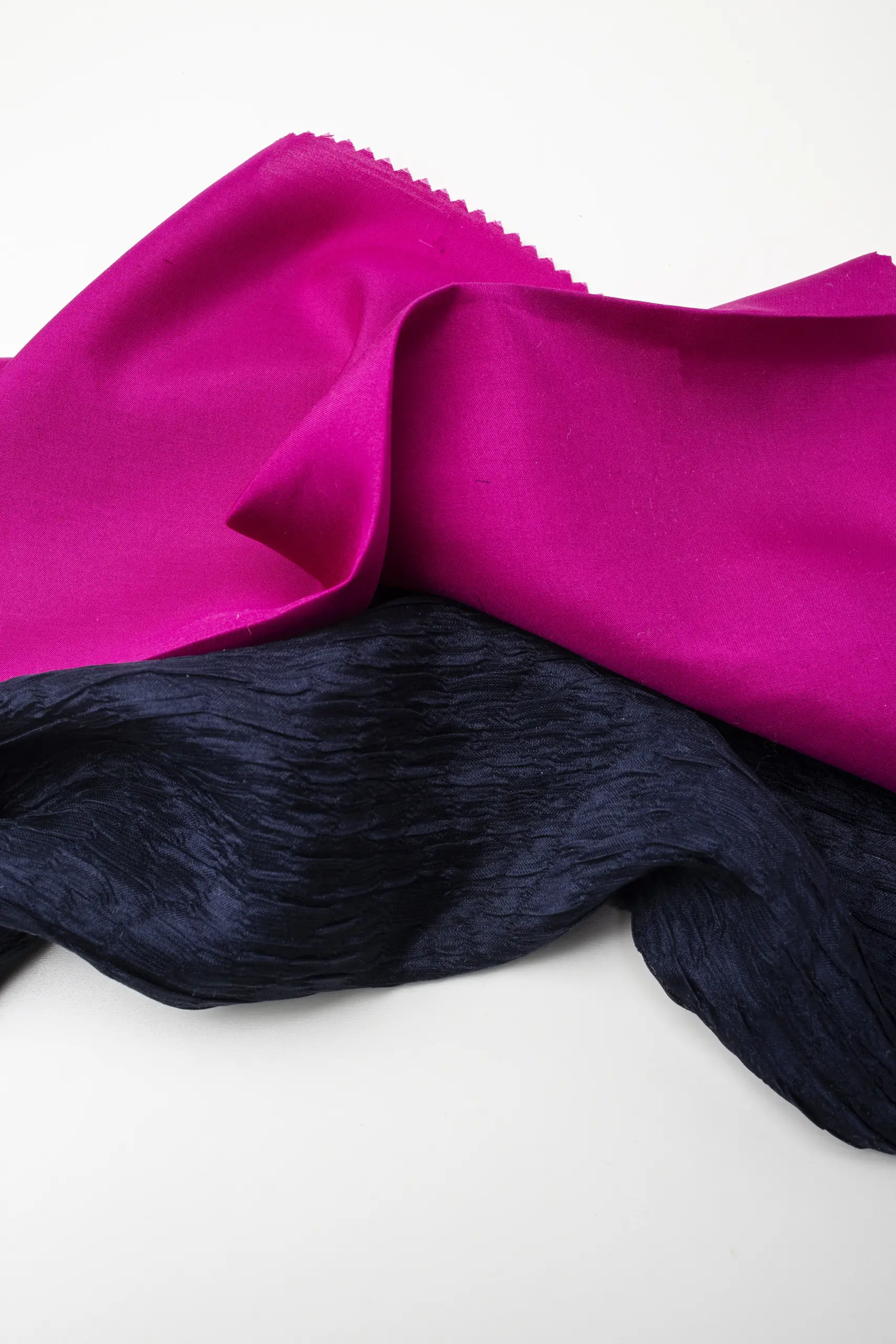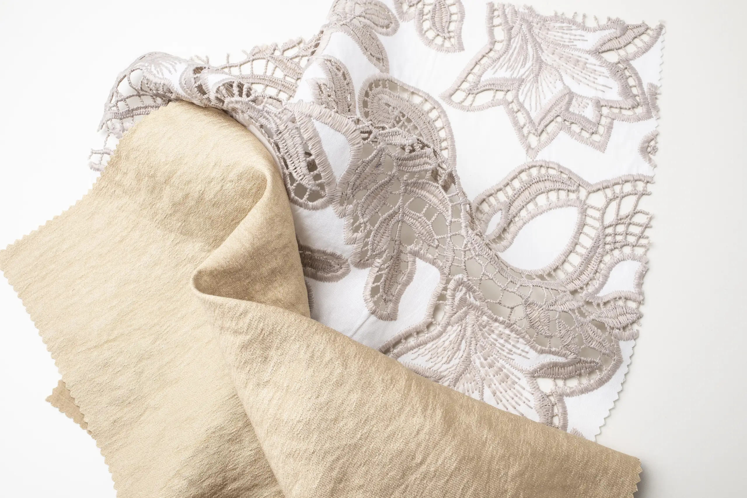 Con i piedi affondati nella sabbia calda e il sale sulla pelle, catturiamo e custodiamo le trame luminose, le superfici vibranti e le delicate imperfezioni che solo l’estate, nel suo momento più autentico, sa donare. Un’enorme roccia si immerge nelle acque turchesi del mare, ipnotizzandoci con le sue profonde sfumature di grigio che riaffiorano nei tessuti avvolgenti di Balli Il Lanificio, mentre i bottoni levigati di Gruppo Uniesse Bottoni si adagiano come sassi e conchiglie lungo il bagnasciuga. Dove la sabbia è asciutta e appena segnata dal vento, la luce dell’alba crea riflessi delicati che accendono i fili impalpabili di ST-Milano Semplicemente Tulle. Poco più in là, le fibre naturali di Pratofabrics by Pratofinish sembrano assorbire le stesse tonalità dell’acqua e degli scogli, dando vita ad un contrasto fresco e luminoso. Sul prato che confina con la spiaggia, una pianta dalle foglie candide e rigogliose richiama le lavorazioni dense e preziose firmate Forza Giovane Art, mentre il raso e il ricamo di Stoffall 2.0 evocano la sabbia scura e compatta lasciata dal passaggio di un’onda, quando ogni granello brilla di umidità. Un piccolo cumulo di sabbia e sassolini tinge le tele di Staff Jersey di calde sfumature beige, mentre le passamanerie di Toschi Passamanerie si intrecciano come la corteccia di un tronco essiccato dal sole estivo, restituendo una materia viva e irripetibile. E, quando le dune si accendono al tramonto, i tessuti firmati Cafissi ne raccolgono le vibrazioni cromatiche, mentre le sete Delta Tex si illuminano di blu e fucsia, riflettendo la luce del crepuscolo sugli scogli e suggellando, ancora una volta, la bellezza senza tempo dell’estate.